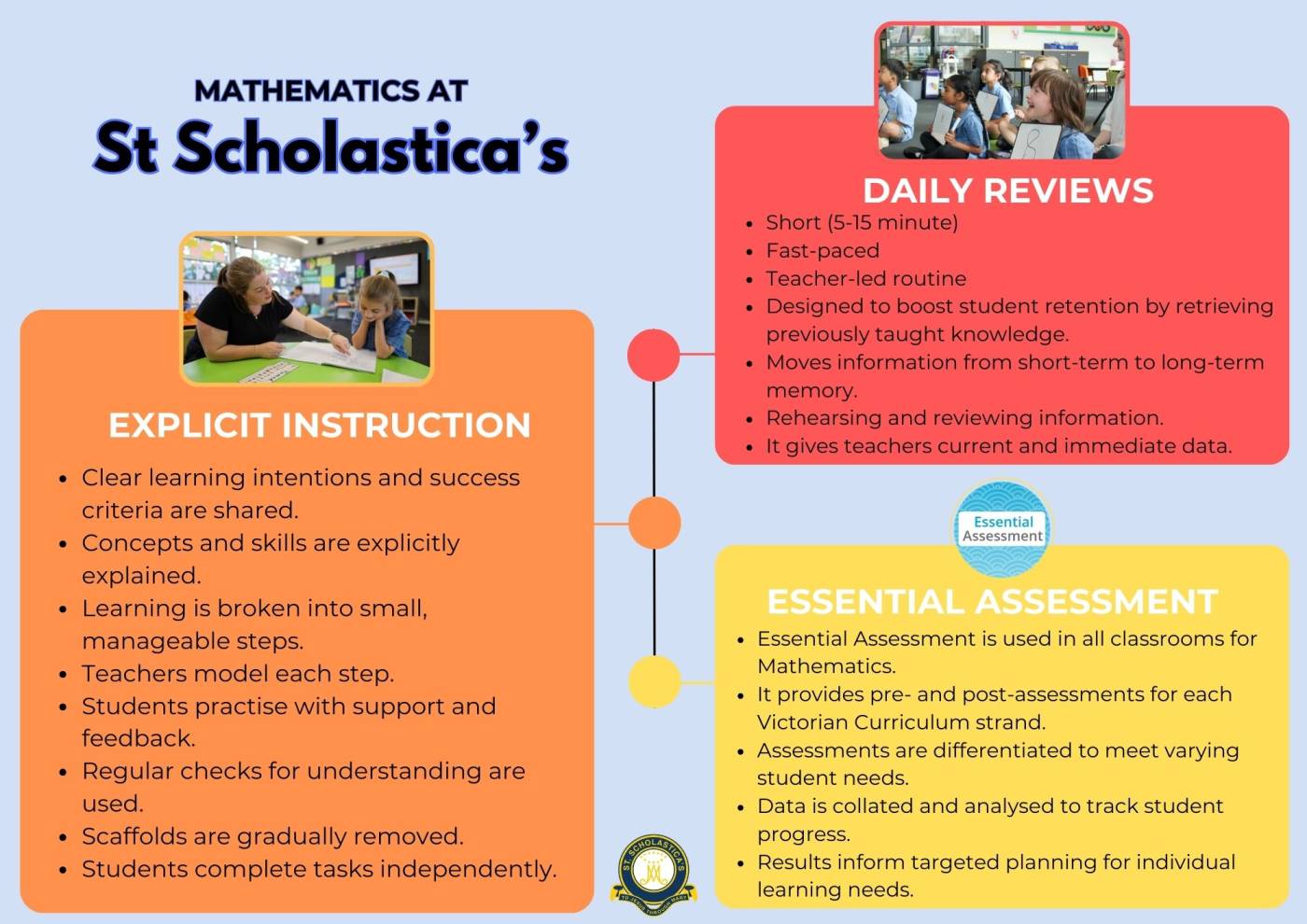 At St Scholastica’s, we emphasise the importance of explicit instruction across all curriculum areas. This approach ensures that students receive clear, direct teaching that breaks down complex skills and concepts into manageable steps.